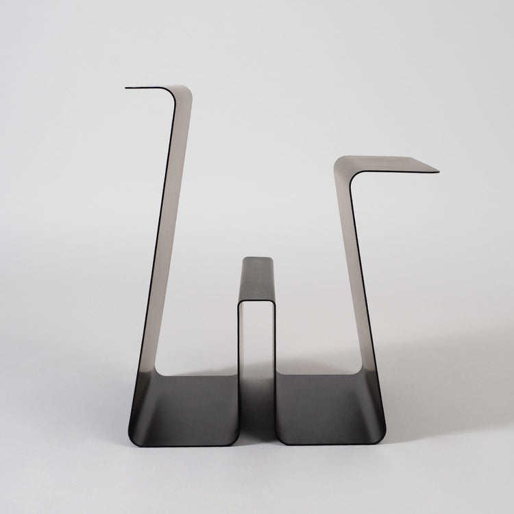 Magazine holder is formed as a result of metal forming a form with twist details. It also allows you to position your items by using the sides as a coffee table.