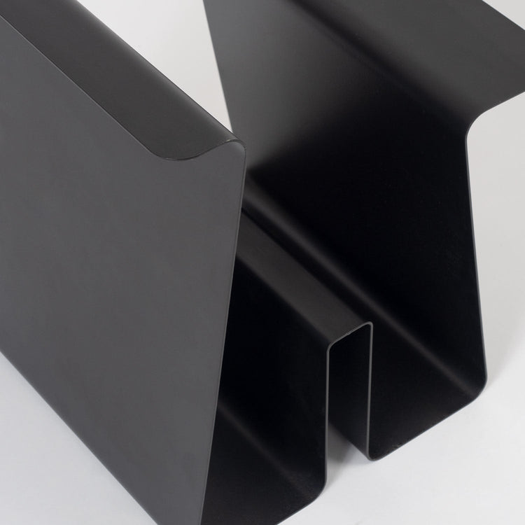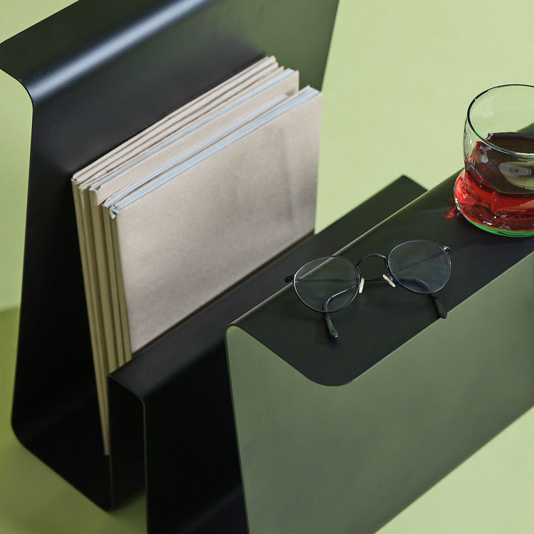 Magazine holder is formed as a result of metal forming a form with twist details. It also allows you to position your items by using the sides as a coffee table.